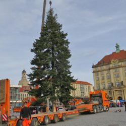 4. November 2025 | Mit einigen Stunden Verspätung rollte der diesjährige Striezelmarktbaum auf einem Schwerlaster auf den Altmarkt. Unter den Augen zahlreicher Passanten wurde er mit dem Kran hochgehoben und in einer vorbereiteten Hülse verankert. Der 22 Meter hohe Nadelbaum ist eine seltene Veitchs ... weiterlesen