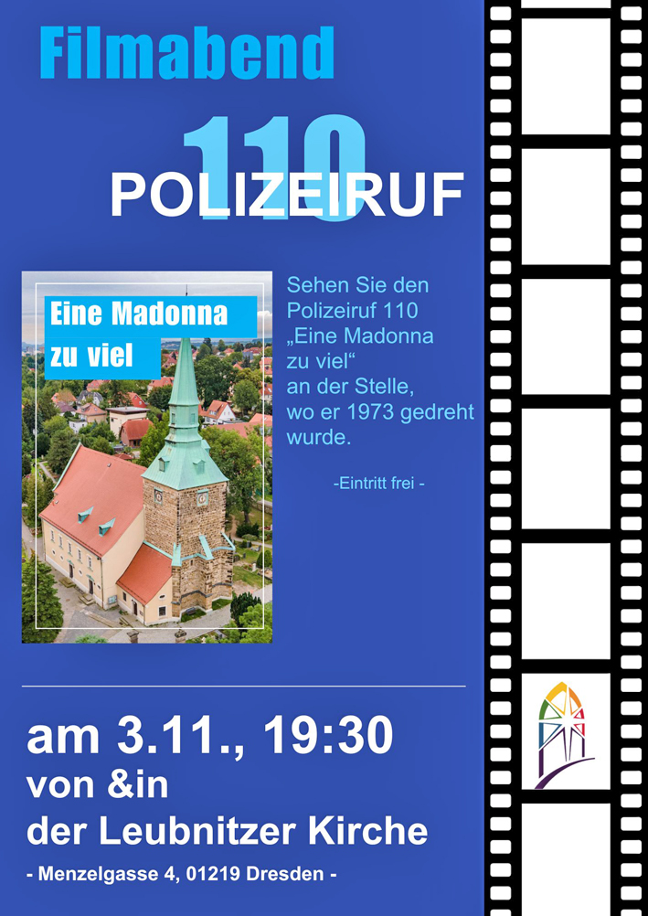 Ein besonderer Kinoabend findet am 3. November, 19.30 Uhr, in der Leubnitzer Kirche, Menzelgasse 4, statt: Es läuft der Polizeiruf „Eine Madonna zuviel“ aus dem Jahr 1973. Neben der spannenden Handlung gibt es einen authentischen Einblick, wie die Kirche, der Pfarrhof und das Umfeld damals im Vergleich zu heute aussahen. Der Abend soll auch ein Dankeschön an die vielen Unterstützer der Sicherungs- und Sanierungsarbeiten an und in der Kirche der letzten Jahre sein. Der Eintritt ist frei. Um eine Spende für immer wieder notwendige Erhaltungsmaßnahmen wird am Ausgang gebeten. (StZ)