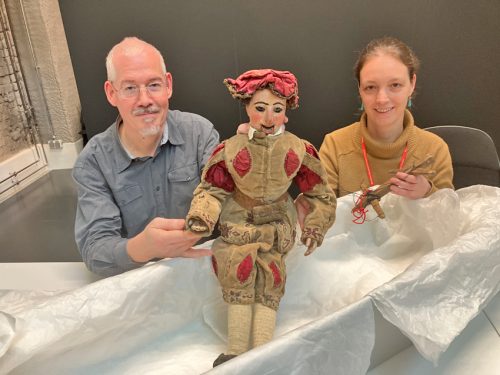 Der Lorgie-Kasper gehört zu den historisch wertvollen Figuren der staatlichen Kunstsammlungen Dresden. Oberkonservator Lars Rebehn und Depotverwalterin Alexandra Löser präsentieren den Kasper nach seiner Restaurierung.