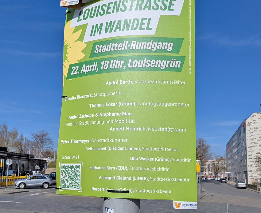 Am 22. April startet 18 Uhr eine Tour durch die Louisenstraße mit dem Stadtbezirksamtsleiter André Barth und weiteren Vertretern von Politik, Verwaltung und Zivilgesellschaft. Die Louisenstraße bildet das Herz der Äußeren Neustadt und steht für stetigen Wandel. Derzeit werden neue Konzepte für mehr Lebensqualität im Viertel für Wohnen, Gastronomie, Einzelhandel und Verkehrsaufkommen entwickelt. Der Rundgang bietet die Möglichkeit, sich mit Akteuren vor Ort über aktuelle Planungen ins Gespräch zu kommen.